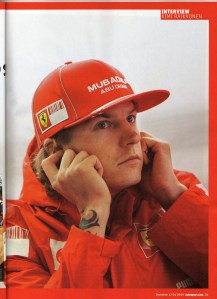 I went out and bought autosport yesterday because there was a tweet on wednesday from one of editors saying there was a fascinating article/interview with Kimi in it. This is the first time I’ve read the F1 racing article and the autosport article contradicts it quite a lot doesn’t it? Particularly the end about why he didn’t go to Macca. AND he didn’t get a standing ovation because he and the rest of the paddock didn’t know it was going to be his last race in Abu Dhabi, it was still assumed he would go to McLaren (that part really annoyed me)