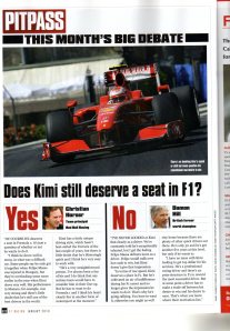 like it was "strangling" him. These are things which need to be read… I’ll let you decide for yourselves. The fourth page is another opinion piece debating whether Kimi still deserves a seat in F1, where Red Bull boss Christian Horner argues yes for Kimi and Damon Hill against. Well, it’s good to know there’s at least one team boss in favour Kimi and whom he hasn’t worked with… yet!