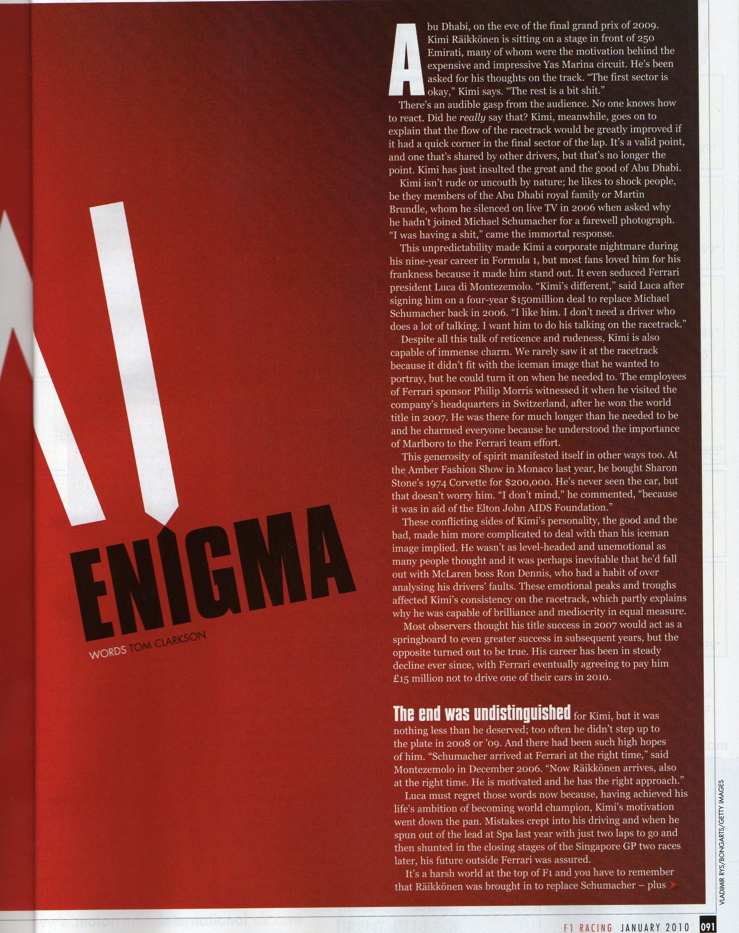 The following pages are from F1 Racing magazine, also courtesy of YiNing. Entitled ‘Cracking the Kimi Enigma’, when it could’ve been simply called ‘Criticising the Kimi mould’, it’s