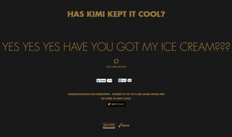 Kimi and the Lotus guys are at it again with another personalised website: www.haskimikeptitcool.com. Catch this video of Kimi’s radio messages from the Abu Dhabi GP, thanks to @F1pPitRadio.