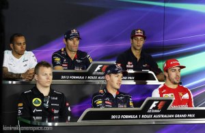 The FIA Press Conference (From back row(L to R)): Lewis Hamilton (GBR) Mercedes AMG F1; Mark Webber (AUS) Red Bull Racing; Daniel Ricciardo (AUS) Scuderia Toro Rosso; Kimi Raikkonen (FIN) Lotus F1 Team; Sebastian Vettel (GER) Red Bull Racing; Fernando Alonso (ESP) Ferrari.