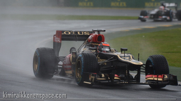 Lotus driver Kimi Raikkonen of Finland takes a bend after heavy rain fell during the third practice session at the Formula One Australian Grand Prix in Melbourne on March 16, 2013. IMAGE STRICTLY RESTRICTED TO EDITORIAL USE – STRICTLY NO COMMERCIAL USE AFP PHOTO / Greg WOOD (Photo credit should read GREG WOOD/AFP/Getty Images)