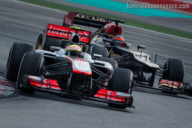 McLaren driver Sergio Perez Mendoza of Mexico (front) and Lotus driver Kimi Raikkonen of Finland drive during the Formula One Malaysian Grand Prix in Sepang on March 24, 2013. AFP PHOTO / Philippe Lopez (Photo credit should read PHILIPPE LOPEZ/AFP/Getty Images)