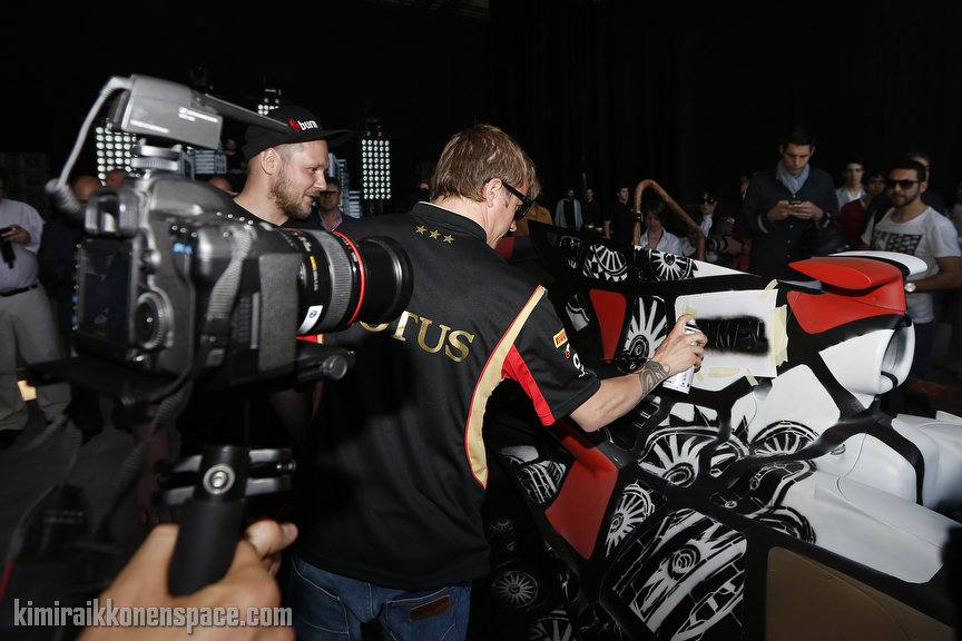 Kimi Rikknen from the Lotus F1 Team and Polish street artist M-City at burn Yard Live in Barcelona on May 9, 2013 in front of the redesigned Lotus F1 car – part of a new creative program from burn, the leading energy drink from The Coca-Cola Company.