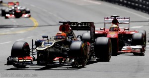 Lotus driver Kimi Raikkonen of Finland leads Ferrari driver Fernando Alonso of Spain during the Formula One Grand Prix at the Monaco racetrack, in Monaco, Sunday, May 26, 2013. (AP Photo/Luca Bruno)