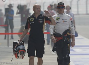 Lotus driver Kimi Raikkonen of Finland walks with a teammate down pit lane prior to the start of the third practice session at the Indian Formula One Grand Prix at the Buddh International Circuit in Noida, India, Saturday, Oct. 26, 2013. (AP Photo/Mark Baker)