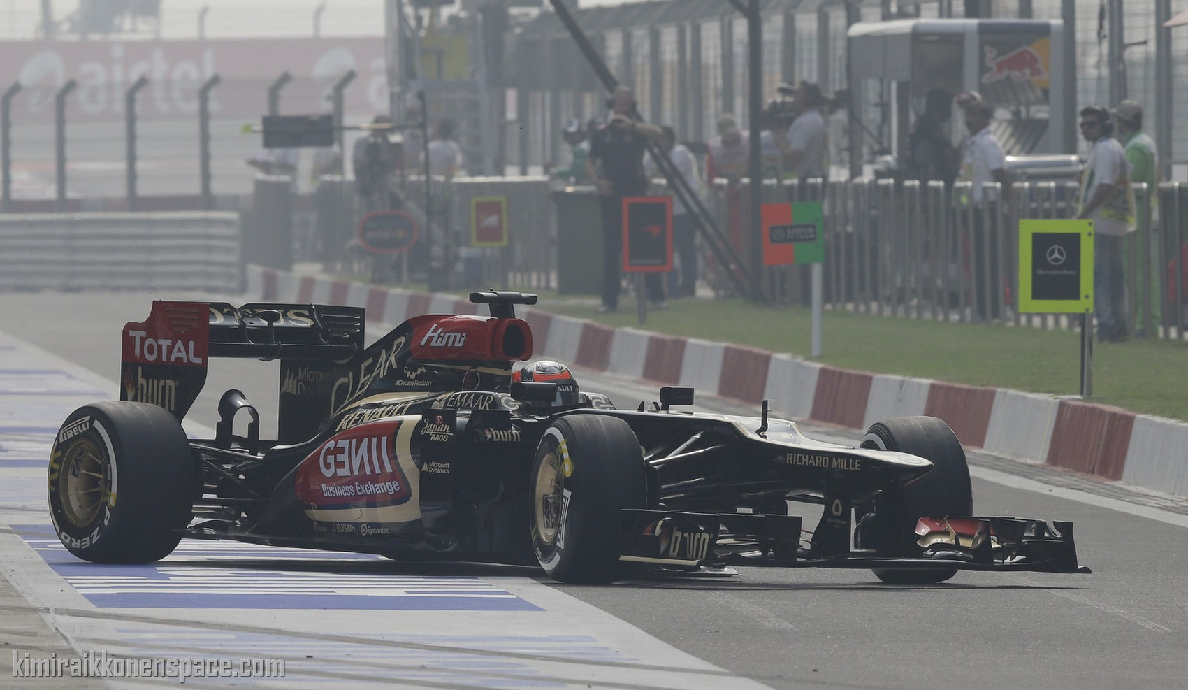 Lotus driver Kimi Raikkonen of Finland steers his car out of his pit lane garage during the third practice session at the Indian Formula One Grand Prix at the Buddh International Circuit in Noida, India, Saturday, Oct. 26, 2013. (AP Photo/Mark Baker)