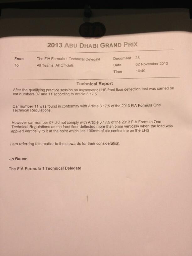 Raikkonen car fails floor test post-qualifying – Lotus team members have been summoned to the stewards after Raikkonen’s car did not pass a floor deflection test after he qualified fifth for the Abu Dhabi Grand Prix. A statement from the stewards said: “car number seven [Raikkonen] did not comply with Article 3.17.5 of the 2013 FIA Formula One Technical Regulations as the front floor deflected more than 5mm vertically when the load was applied vertically to it at the point which lies 100mm of car centre line on the [left-hand side].”