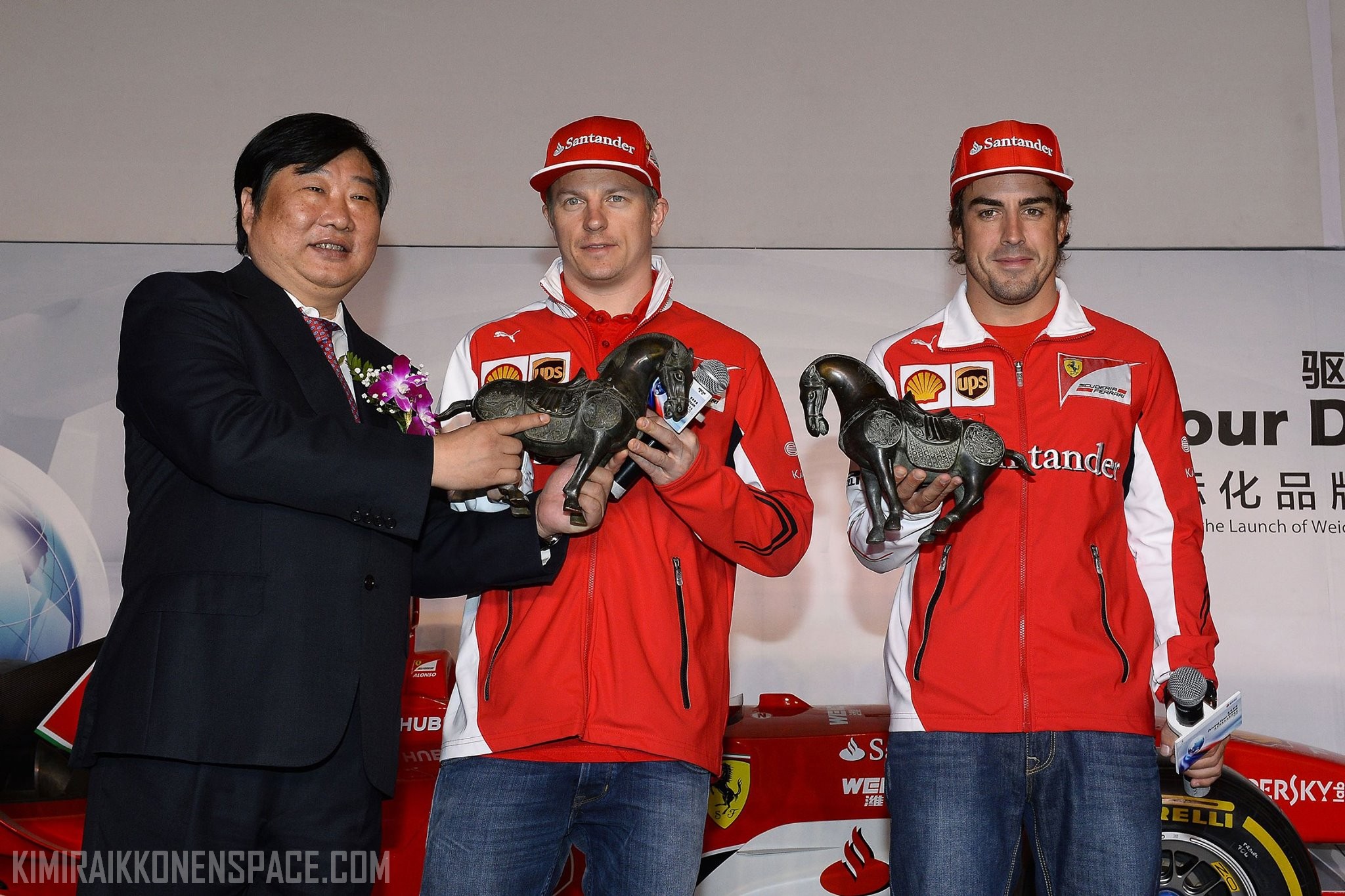 The drivers were introduced by the President of Weichai, Xuguang Tan who was presented with a bronze Cavallino to celebrate the partnership between the two companies. According to the Chinese horoscope this is the year of the horse and in an exchange of gifts, those from Weichai were also based on sculptures of horses. The drivers answered questions relating to this weekend’s race, which gets underway tomorrow with the start of free practice. Fernando Alonso was particularly complimentary about the Shanghai circuit. “It’s a track the drivers like a lot and winning here last year was a great feeling.”