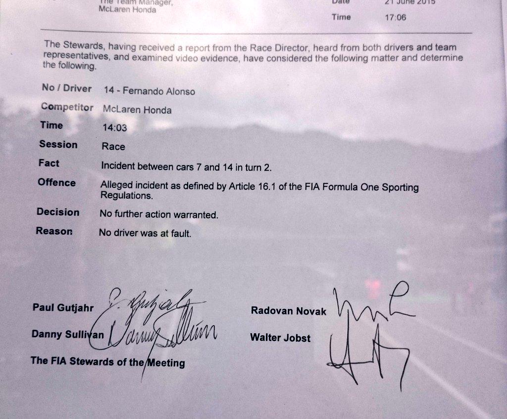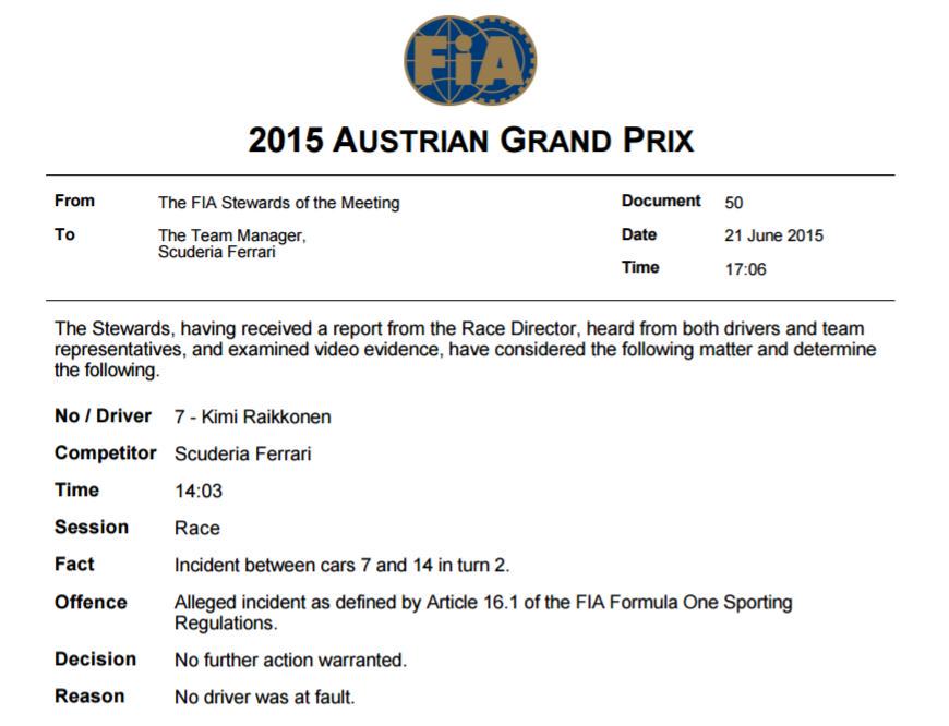 No action warranted – both Kimi Raikkonen and Fernando Alonso are innocent as far as the accident is concerned, according to FIA.